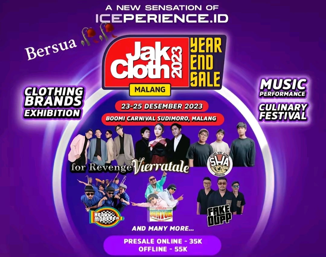 Mengusung tema ‘JakCloth Year End Sale 2023’, event ini akan berlangsung di Boomi Carnival Sudimoro, tepatnya di Jalan Ikan Tombro No. 27, Mojolangu, Kota Malang.