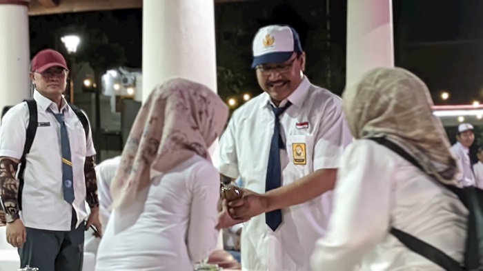 Kepala Dinas Pendidikan Kota Pasuruan, Lucky Danardono, tampil berseragam SMA lengkap dengan ranselnya.