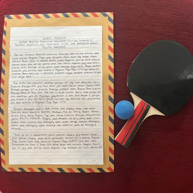 Surat itu disertai dengan bola dan bet pingpong sebagai simbol “dipingpong” terkait kebijakan UKT.